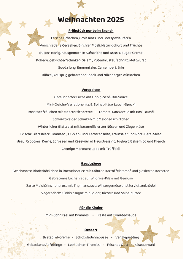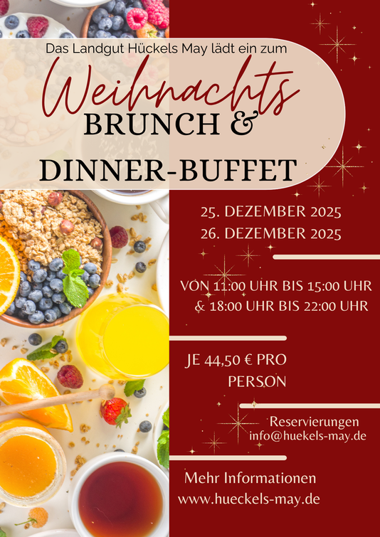 Genießen Sie einen entspannten Start in die Weihnachtstage und verwöhnen Sie Ihre Sinne mit einer reichhaltigen Auswahl an köstlichen Speisen und Getränken.Sie möchten lieber Abends zu uns kommen? Kein Problem - Wir verwöhnen Sie auch mit einem tollen Abendbuffet.